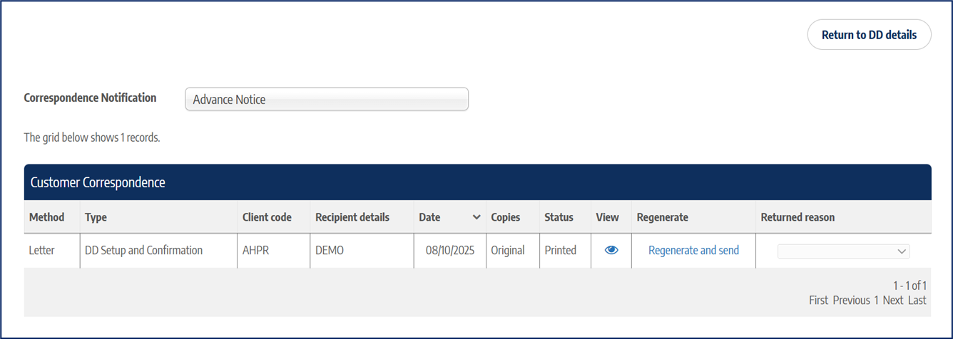 3. All correspondence that is related to the Direct Debit for the customer can be viewed by selecting the ‘View’ icon. A PDF version of the original will be displayed