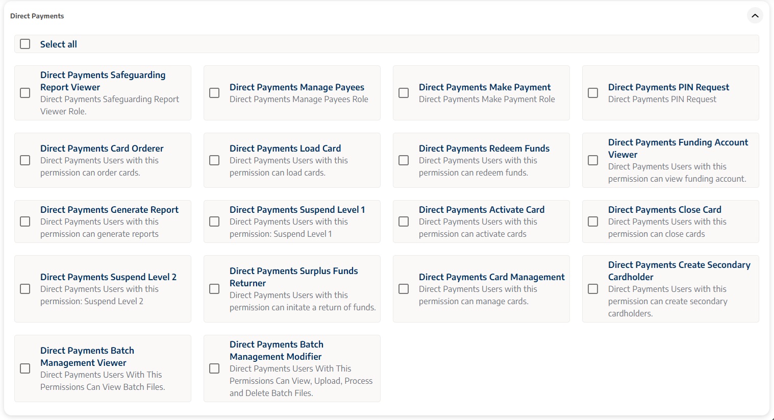 - Direct Payments Manage Payees - Allows users to add, edit or remove payees on behalf of cardholders