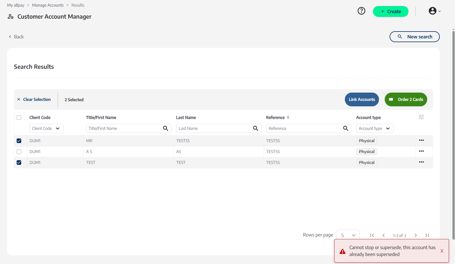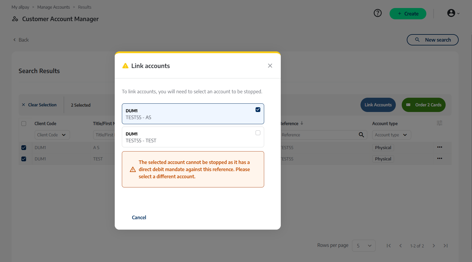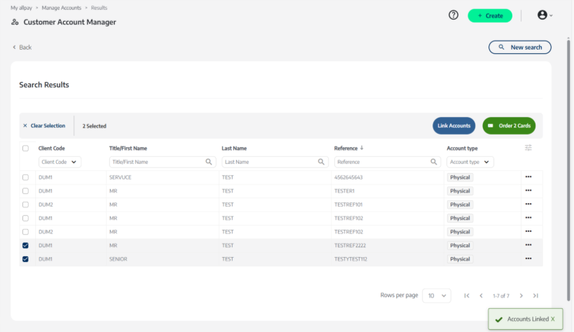 - Search for the accounts in Customer Account Manager via Payments Hub and select the two accounts that need to be linked. You'll see a Link Accounts button appear; click that button.