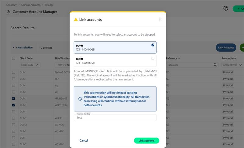 - You'll now need to enter a reason as to why you are stopping this account, they will then be superseded together. When you stop one account, it doesn't stop the functionality of that account but it does stop it appearing in searches.